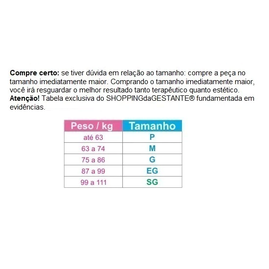 Ao comprar a sua, considere como premissa 2 (dois) fatores relevantes: o massageamento é terapêutico, já o aperto é estético e deve ser na medida certa (não deve ser excessivo). Portanto, caso seu peso esteja no limite das tabelas, opte pelo tamanho imediatamente maior no sentido de facilitar o exercício de isometria e o melhor resultado. A regra é a gestante fazer uso da cinta calça gestante até o final da gestação, sendo recomendada inclusive para o deslocamento no dia do parto.