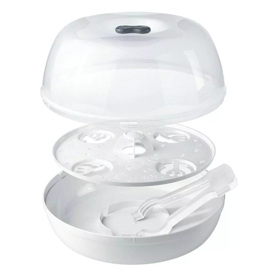 Composto de: tampa, suporte interno para mamadeiras e acessórios, base com capacidade para 200ml de água e pinça para retirar as peças após esterilização.