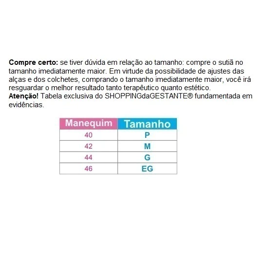 Sutiã para amamentação SG-338 da Moderna: Auxilia a musculatura no trabalho de sustentação da mama e previne os problemas de retenção do leite e flacidez, decorrentes do peso excessivo. Possui alças largas e reguláveis, fivela com dispositivos de encaixe, bojo anatômico para perfeita acomodação da mama, reforço para sustentação, abotoamento triplo nas costas e abertura aureolar.
